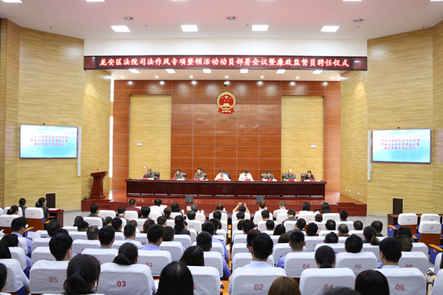 为深入学习领会习近平总书记关于“纠正四风不能止步,作风建设永远在路上”的重要批示精神和全市法院司法作风整顿专项活动动员部署电视电话会议精神,5月18日,龙安区法院组织全体干警召开司法作风专项整顿活动动员部署会议暨廉政监督员聘任仪式。区人大常委会主任郭俊平、区委常委、政法委书记舒兆学出席会议并作重要讲话。会议由党组副书记、副院长刘振华主持,区纪委监委派驻区政法委纪检组组长李俊英同志及部分廉政监督员参加会议。