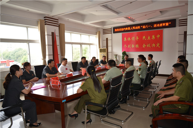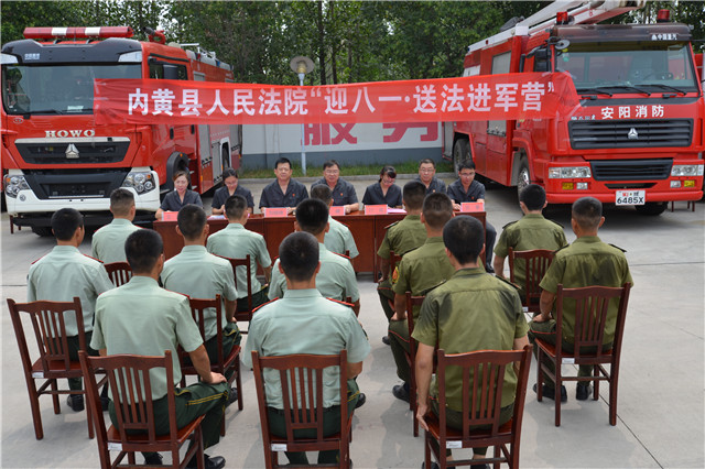 为庆祝“八一”建军节的到来,充分发挥司法职能,全力做好新形式下的涉军维权工作,7月30日上午,内黄县法院党组书记、院长王海军带领党组成员、副院长张峰、政治处主任刘晓峰及刑事、民事、行政、执行法官等一行10余人来到武警内黄县消防大队,通过召开座谈会解答法律问题、赠送法律书籍等形式开展送法进军营活动。