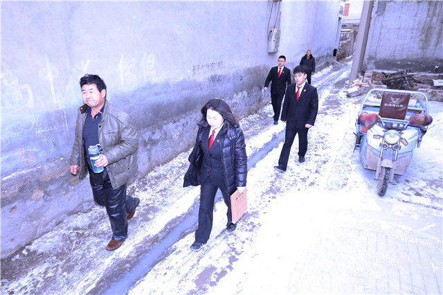 12月27日下午,寒风凛冽,小雪飘飘,安阳县人民法院立案庭干警郭月红、齐黎曦等一行5人深入当事人村庄,上门为71户村民办理了执行立案和委托手续。