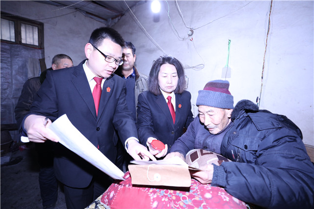 因案件标的大,涉案人员众多,该院立案庭干警与村民约好时间,决定到村内为71户村民现场办理立案和委托手续。12月27日下午,气温低至零下7度,天空还飘起了零星雪花,干警携带卷宗相关材料,如期来到71户村民居住地约定的场所,就立案相关细节和注意事项进行详细讲解后,依次开始办理手续。查看身份证、登记联系方式、签字、按手印等,整个立案过程持续3个多小时。期间,还专程上门为躺在病床上的两位老人办理了立案手续,受到了人民群众的热烈好评。