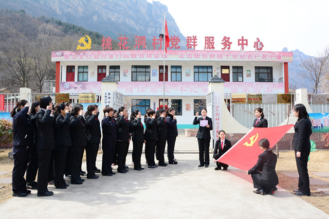 “我志愿加入中国共产党,拥护党的纲领,遵守党的章程……”在桃花洞村村委会广场,面对庄严的党旗,女干警们高举右手宣誓,重温入党誓词,更为深刻地体会老一辈共产党人敬党、爱党的崇高的心。