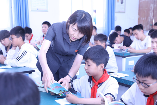 为学生们发放漫画口袋书“普法宝典”。