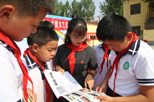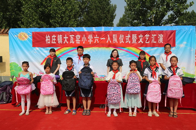 为深化未成年人思想道德建设,关心少年儿童健康成长, 5月31日,在“六一”国际儿童节来临之际,北关法院政治部主任宋萍、副主任王瑾、综合办公室主任姚俊峰、工会负责人张瑛带领法院志愿者小分队一行来到柏庄镇大瓦窑小学,参加了校六一入队仪式暨文艺汇演,并为全校师生送去了司法的关爱、节日的祝福和精心准备的礼物。孩子们对法官的到来感到非常开心,争先恐后的为法官们系上红领巾表达心意。