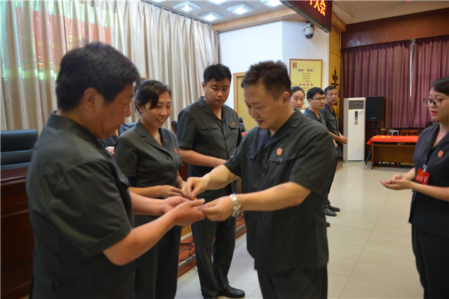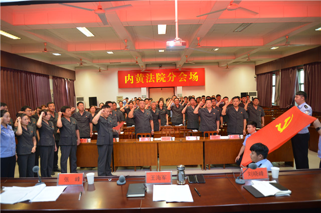 会议伊始,奏放国歌,整个会议庄严而肃穆。接着由刘晓峰副院长为大家宣读《内黄县法院关于对23名模范党员表彰的决定》,紧接着王海军院长为优秀党员示范先锋模范代表颁发荣誉奖牌并合影,为六月入党党员和新入党党员发放党徽并合影,随后全体党员起立,重温入党誓词。