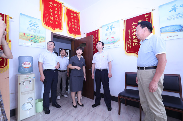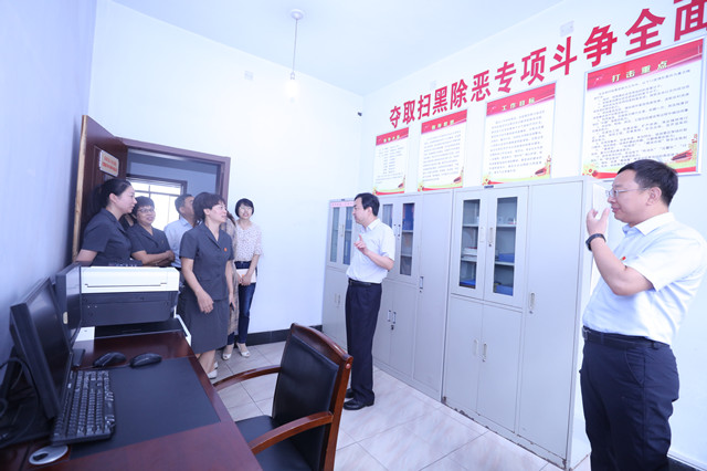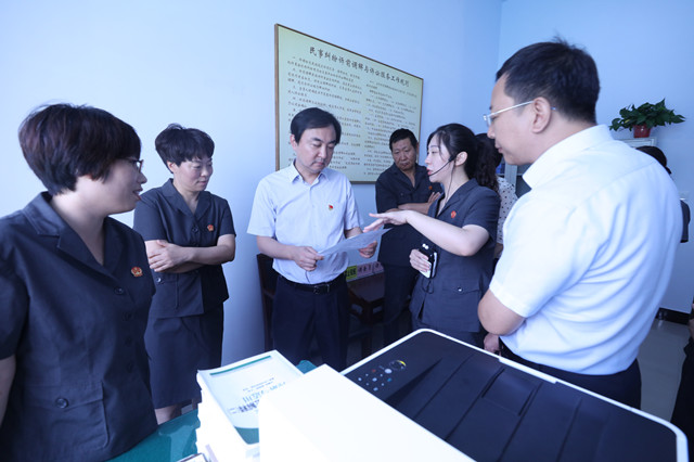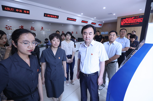 曹书记一行先到白璧法庭实地调研,参观了标准化篮球场、多功能审判车、小菜园、立案大厅、庭审语音识别系统、家事审判庭等。曹书记一行还饶有兴致地登上多功能审判车,体验能够实现同步视频直播的“流动小法庭”带来的便捷;在立案接待室,曹书记对该庭坚持以人民为中心的发展理念,探索推出的“掌上诉讼”二维码、移动微法院等一系列举措充分肯定,对智能化审判庭实现了庭审过程同步录音录像、同步语音转换,以及网上审批文书、电子签章等办公办案办事的“一条龙”服务连连称赞。之后,曹书记一行来到法院执行局,观看了安阳县法院决战决胜基本解决执行难系列宣传版面、执行指挥中心有关执行案件规范智能巡查系统、执行质效分析系统和执行指挥远程操作系统,详细询问案件的实际执结率、法定期限内结案率等情况,还现场连线一线执行干警并叮嘱干警们路上注意安全。在该院立案大厅,曹书记一行体验了自助立案、档案查询和电子翻书等便民化服务终端,还先后到该院文体活动室、人大代表工作室、扫黑除恶专项斗争办公室、党建活动室、荣誉室等实地调研。