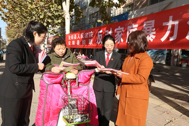 11月25日是国际反家庭暴力日,为预防和制止家庭暴力,11月25日上午,河南省安阳县人民法院联合安阳县妇联深入辖区白璧镇人口聚集地,开展了以“反对家庭暴力、创建和谐家庭”为主题的普法宣传活动。此次活动共发放各类宣传资料和法律手册1000余份,现场答疑解惑30余人次,进一步增强了广大妇女和家庭的反家暴意识,收到良好效果。