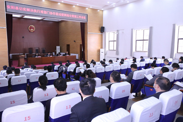为推动综合治理执行难工作扎实开展,确保中央、省委决策部署的全面贯彻落实,切实解决执行难问题,3月28日上午,由安阳县政法委牵头、安阳县法院主办的安阳县切实解决执行难部门协作联动暨网格化管理工作会议在安阳县法院南楼审判庭召开。县委常委、政法委书记曹阳出席会议并讲话,县纪委、县委组织部、县委宣传部等31个部门、9个乡镇领导及县法院执行局全体干警参加了会议。会议由该院党组书记、院长景瑞红主持。