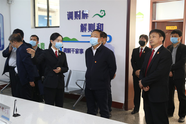 蒋志安一行在北关法院执行局门岗接受体温检测,实地查看了北关法院道路交通事故损害赔偿纠纷网上数据一体化处理中心和诉调对接中心,详细询问了案件处理流程,听取了李春旺院长就北关法院引导多元主体积极参与矛盾纠纷化解,不断完善人民调解、行政调解、司法调解有机衔接、协调联动工作机制所做的汇报。在诉讼服务中心,蒋志安副主任听取了北关法院“两个一站式建设”简要汇报,现场了解并体验北关法院当场立、自助立、网上立、就近立“四立”和一站通办、一号通办、一网通办、一次通办“四通办”,感受智慧法院建设带来的惠民便民成效和法院在完善司法为民,维护人民合法权益等方面的创新和努力。