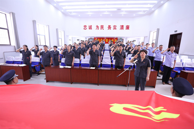 面对鲜红的党旗,全体党员高举右手庄严宣誓,重温入党誓词,表达对党的忠诚和为党的事业奋斗终身的决心。随后,景院长从新冠肺炎疫情发生以来,以习近平同志为核心的党中央高度坚持把人民群众的生命安全和身体健康放在第一位,统筹全局、果断决策入手,结合近期法院实际工作,对全院党员干警提出具体要求。