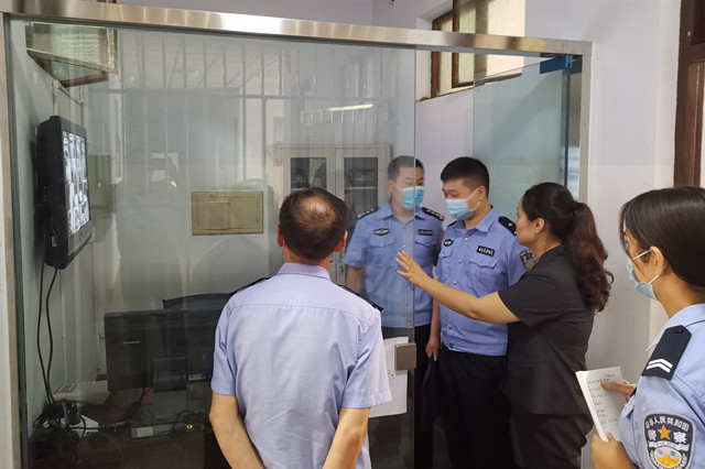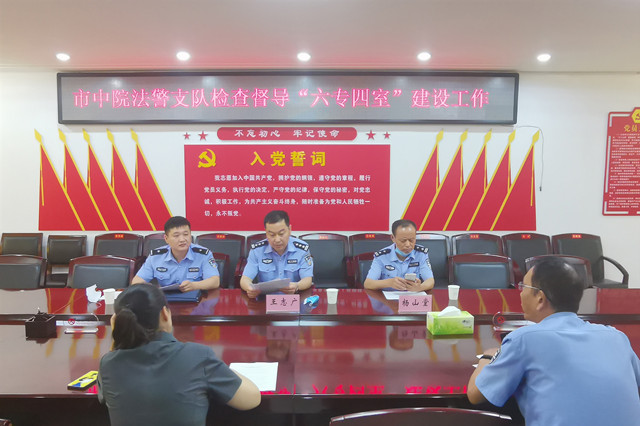 王志广支队长一行先后到该院羁押室、羁押专用通道、装备室、专用囚车库等场所进行了实地查看,详细了解了该院“六专四室”建设情况。