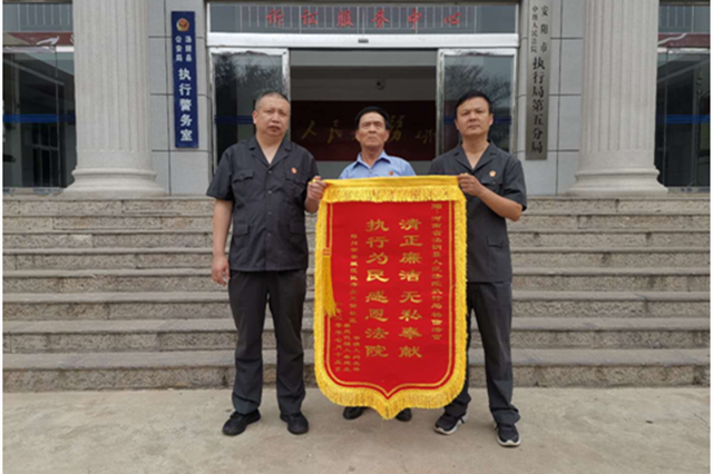 7月27日,秦某受申请人闫某委托,来到河南省汤阴县法院执行局,将一面镶有“清正廉洁 无私奉献 执行为民 感恩法院”字样的锦旗送到杨法官手上。“之前对这个钱都不抱希望了,没想到杨法官真的把这个“死案子”变成“活案子”了,感谢汤阴法院,感谢杨法官!”