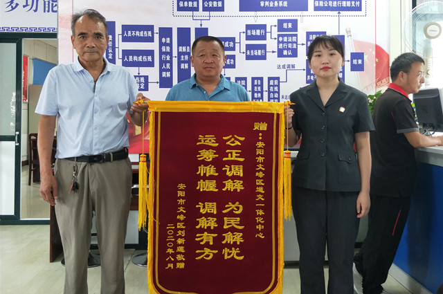 7月1日,赵某驾驶电动三轮车与刘某驾驶电动自行车发生碰撞,造成刘某调解难度大,调解员充分考虑各方实际困难,反复与双方当事人沟通,确定调解数额。中心常驻法院干警又从法律层面向双方当事人释明确定各项费用的法律依据,让当事人切实感受到了公平正义,最终该案于当日调解成功,并当场履行完毕,双方化干戈为玉帛。刘某拿到赔偿款后,心中非常激动,特向文峰区道交一体化处理中心送来锦旗以示感谢。