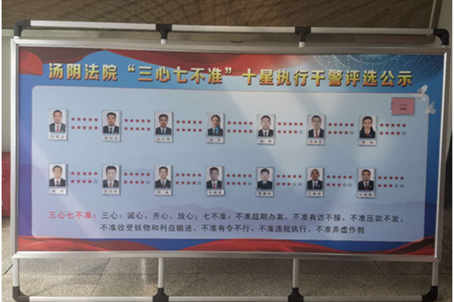 为深入贯彻落实安阳市中院“抓规范、提质效、强执行”的实施意见和关于开展“三心、七不准”十星执行干警活动的工作要求,进一步规范执行行为,促进执行工作全面提质增效,9月20日,汤阴县法院开启了“三心、七不准”十星执行干警评选活动。