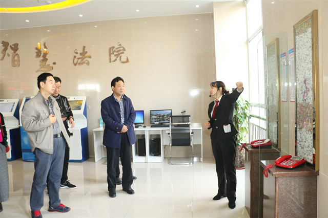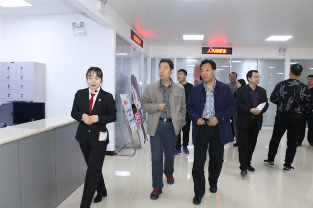在法院工作人员的带领下,刘安宁一行先后参观了诉讼服务中心、马小新劳模工作室、接待调解区、龙法职工之家、家事审判庭、心理疏导室、羁押室、廉政教育室、法心驿站、体训中心等区域,并就相关软、硬件设施作了详细了解。在参观过程中,双方就智能诉讼服务中心功能设置、案件文书送达、案件繁简分流、“两个一站式服务”新模式、“六专四室”设置等工作的主要做法、人员配备等情况进行了详细介绍。