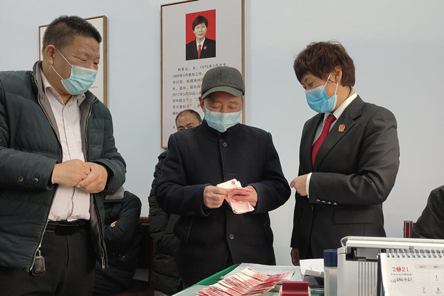 法官刘美云了解相关情况后,专门为案件开辟了“绿色通道”,优先办理,优先调解。一边耐心安抚9名农民工的情绪,一边安排人员迅速与两名被告取得联系。通过电话明理释法后,两被告同意到法庭当面调解案件。调解过程中,9名农民工面对拖欠工资的被告赵某、贠某情绪激动,调解工作一度陷入僵局。刘美云法官采取背靠背调解形式,分别做当事人思想工作,促使双方心平气和坐下来说事儿。调解过程中,双方当事人纷纷诉说了事情经过和内心想法,当得知被告确实受新冠肺炎疫情影响暂时兑付出现困难的情况后,法官刘美云法情并用,反复与双方进行沟通交流,最终找到了化解案件的平衡点,双方签订了被告先履行部分案款,剩余案款限期履行的调解协议。3月2日,案款履行完毕。民工们为表示感谢,于是便出现了文章开头的一幕。