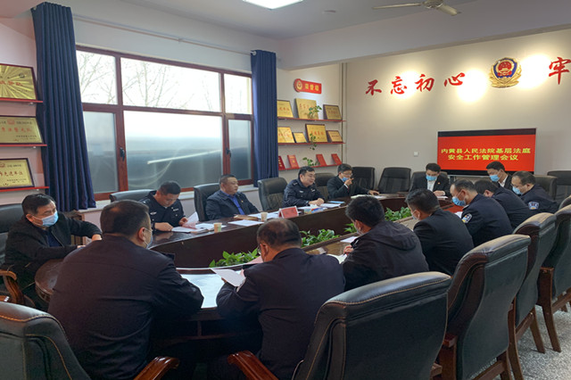 为切实贯彻落实最高院下发的《人民法庭安全管理规范(试行)》,进一步提高法庭工作人员的责任意识和安全保卫意识,提升安保工作能力,严格保障法院审判工作安全进行,2021年3月5日下午,河南省安阳市内黄县人民法院法警大队在大队会议室组织召开了关于基层法庭安全管理的会议。