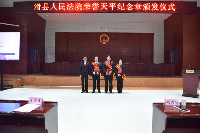 4月21日下午,为表彰从事法院工作累计满三十年、为人民法院工作作出贡献的法院工作人员,根据最高法院《关于颁发荣誉天平纪念章的办法》,滑县法院在第一审判庭举行荣誉天平纪念章颁发仪式。党组书记、院长史军峰出席仪式并讲话,全院干警参加仪式。