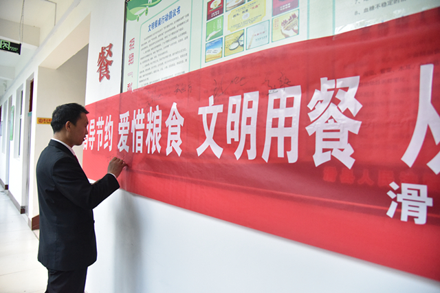 一是营造氛围。在餐厅醒目位置悬挂“文明餐桌”宣传标语、海报,在机关餐厅入口处组织开展“文明餐桌行动”承诺签名仪式。摆设“文明餐桌”温馨提示牌,提醒干警合理取餐,引导广大干警形成“吃多少盛多少”思维意识,杜绝“舌尖上的浪费”。