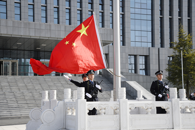 国歌激昂,国旗飘扬。上午7时40分,全体人员整齐着装、列队肃立,精神饱满地期待这一神圣时刻的到来。8时整,司法警察迈着矫健的步伐、列着整齐的队伍护卫鲜艳的五星红旗到达升旗台。在雄壮的国歌声中,五星红旗冉冉升起,全体干警站姿挺立,面向冉冉升起的国旗行注目礼,进一步激发了大家爱党爱国、敬业奉献、履职尽责、奋发有为的热情和干劲。