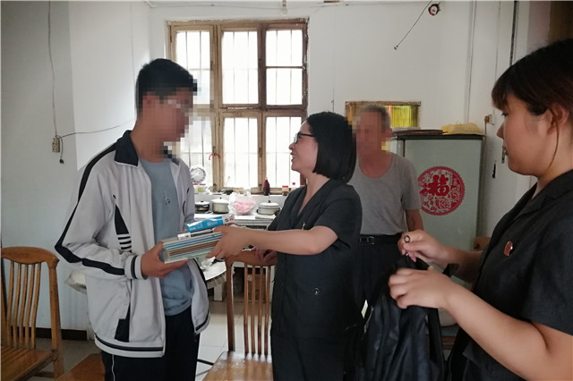 5月31日,临近六一儿童节,文峰区法院民事审判庭副庭长、全国优秀法官祝昉再次来到甜水井新营街社区,为贫困学生小宇送上了节日礼物和祝福。小宇是一名九年级的学生。每年六一前后,祝昉都会到家中看望小宇。虽然与祝昉已经很熟悉了,但临近中考,小宇的脸上难免带着一丝紧张。