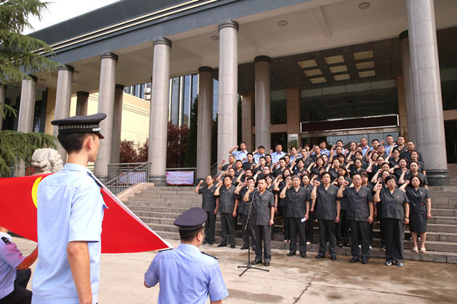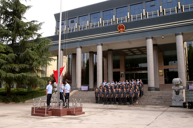 8点20分,由3名法警组成的国旗护卫队迈着坚定有力的步伐,昂首挺胸地走向升旗台。大家列队整齐,精神饱满。随着《义勇军进行曲》奏响,鲜艳的五星红旗冉冉升起,全体庄严肃立,面向国旗行注目礼,表达对党和国家的美好祝福。