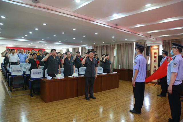 下午4点,北关法院会议室内响起雄壮的国歌声——全体党员齐唱国歌。在党组书记、院长李春旺的带领下,全体党员重温入党誓词,重忆入党初心。在铿锵誓言中,表彰大会正式开始。