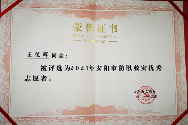 近日,安阳市文明办表彰了一批在防汛救灾过程中涌现出的优秀志愿服务先进典型,滑县法院城郊法庭副庭长、员额法官王俊晖荣获2021年安阳市防汛救灾优秀志愿者称号。