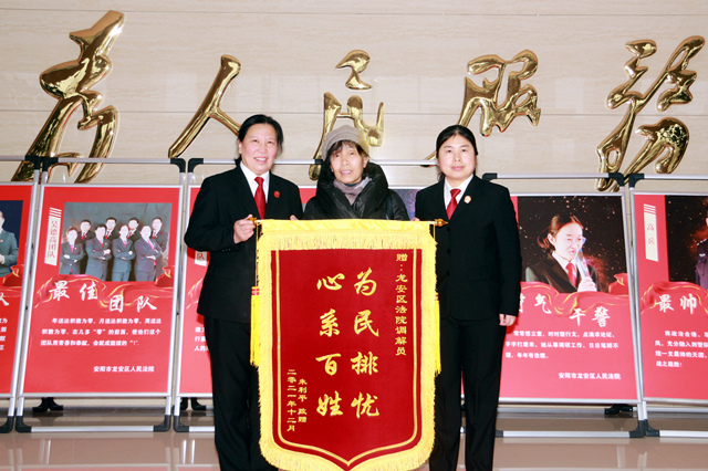 2021年12月23日,在安阳市龙安区人民法院人民调解工作室内,朱女士送来了锦旗,感谢人民调解员李玉霞诉前化解了纠纷。