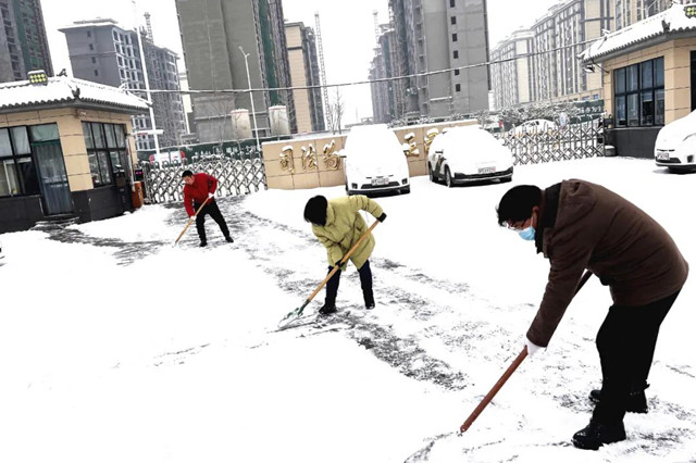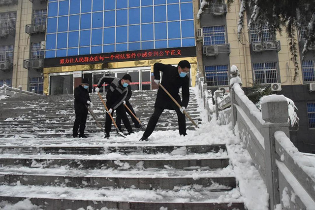 上午8时,机关院内一片热火朝天,史军峰院长带头,拿起铁锨开始扫雪铲冰。干警们个个不畏严寒,干得热火朝天,有的用铁锹向两边清理积雪,有的在后面奋力用大扫帚扫雪,有的用小扫把清扫栏杆上的积雪,积雪溅在衣服和鞋上都毫不在意,大家越干越起劲,他们中,有刚从防疫执勤岗位上换班回来的“疫”线勇士,有保障干警正常就餐的餐厅师傅,有为了保卫机关安全24小时值守的安保人员,忙碌的身影筑成了一道靓丽的风景线。