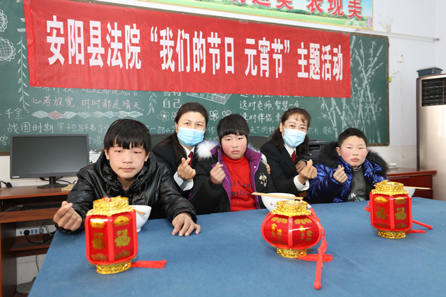 元宵佳节来临之际,安阳县人民法院组织开展以“我们的节日·元宵节”为主题的“暖心汤圆关爱留守儿童”志愿服务活动。该院干警走进辖区韩陵镇目村小学,为3名留守儿童送去汤圆、灯笼等爱心礼物,并通过煮汤圆、猜灯谜、话理想、做游戏等形式,让留守儿童快乐成长。