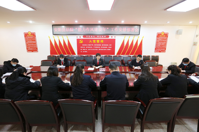为深入学习贯彻党的十九届六中全会精神,落实省、市、县“能力作风建设年”活动要求,进一步提高党员干部思想政治素质和业务工作能力,3月18日,安阳县人民法院召开“能力作风建设年”工作安排部署会,活动各牵头部门及办公室成员参加了会议,会议由该院党组副书记、常务副院长马玉萍主持。