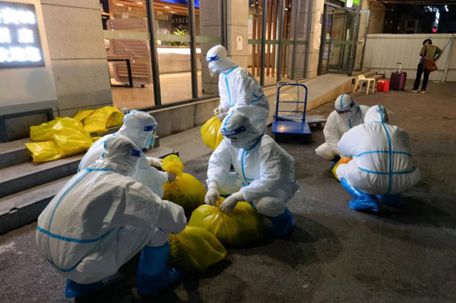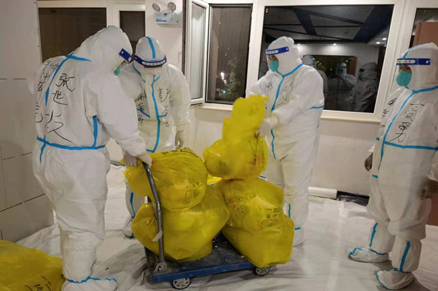 2022年4月21日,张世友、刘鑫两名同志接到疫情防控命令,立即收拾行装,火速赶往定点隔离点执行隔离人员疫情防控任务。连续14天,张世友和刘鑫两名同志每天早上5:30准时投身疫情防控工作,按照隔离点任务分工,进行核酸检测、隔离区消杀、医用垃圾清运、饮食搬运分发等防疫工作。繁重的任务让他们忘记了时间,顾不上休息;封闭的隔离服使他们的衣服被浸湿。常常忙到下午一两点,他们才能腾出些许时间简单吃点午饭,便又迅速投身防疫工作,忙忙碌碌一直到深夜11点左右。有时候累了,他们便在空闲时间席地稍作休息。