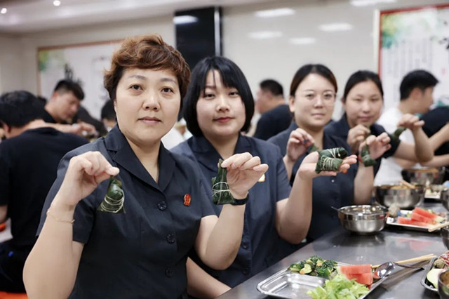 在干警和食堂师傅的共同努力下,几百个粽子成型出炉。在四溢粽叶清香中,大家感受着浓浓的节日氛围。