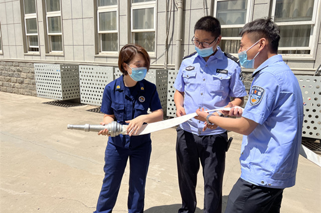 随后,县消防队人员全面检验院内灭火器、消防栓及泵房等消防设施的情况。最后在审判楼一楼,消防人员详细讲解消防栓的使用和注意事项,并进行了消防栓水压测试演练,通过直观的方式,让干警对消防安全常识有了更为清晰的了解和掌握。