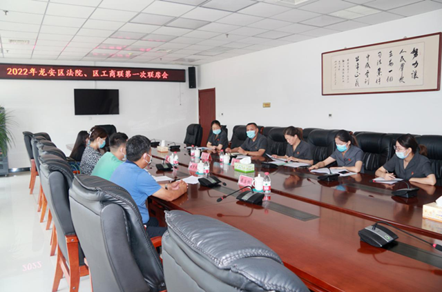 为深入贯彻落实习近平总书记关于民营经济发展重要指示精神,更好地运用法治手段服务保障民营经济健康发展,2022年6月16日上午,龙安区人民法院与区工商联召开2022年第一次联席会议。龙安区法院立案庭庭长张素梅、审管办主任郭玉峰、区工商联秘书长康梦利、特邀商会代表崔玉钧等以及负责相关工作人员出席会议。