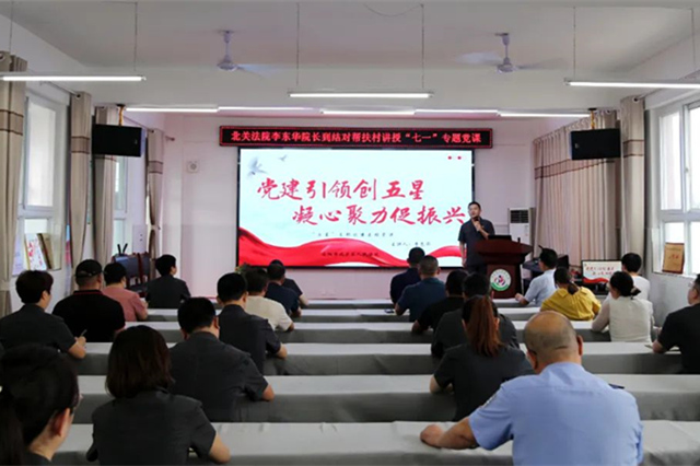 “七一”将至,为激发党员干部干事创业的精气神,增强党员队伍活力、向心力和战斗力,6月30日上午,北关区人民法院在结对帮扶的柏庄镇大瓦窑村开展了“迎七一,讲党课”主题活动,北关区法院党组书记、院长李东华向大瓦窑村村干部和北关法院党员干警,讲授了一堂生动的党课。