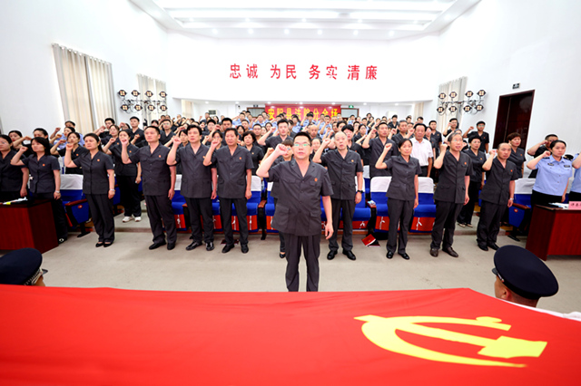 7月1日,安阳县人民法院组织开展“庆七一重温入党誓词”活动。该院全体党员干警在党组书记、院长郭万兴的带领下,面对鲜红的党旗庄严宣誓,通过重温入党誓词,引导党员干警锤炼忠诚品格、强化自我约束,不断提升责任感和使命感。