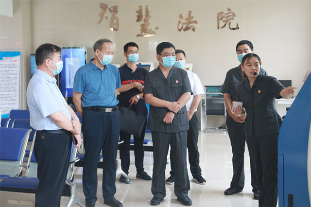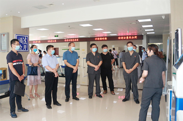 许文清一行实地查看了龙安区法院诉讼服务中心、审判法庭、执行指挥中心、马小新劳模工作室、图书室等智慧场馆设施。现场体验了自助立案系统、诉讼风险评估一体机、虚拟导诉系统、审判直播系统和语音识别转换等智慧司法成果。