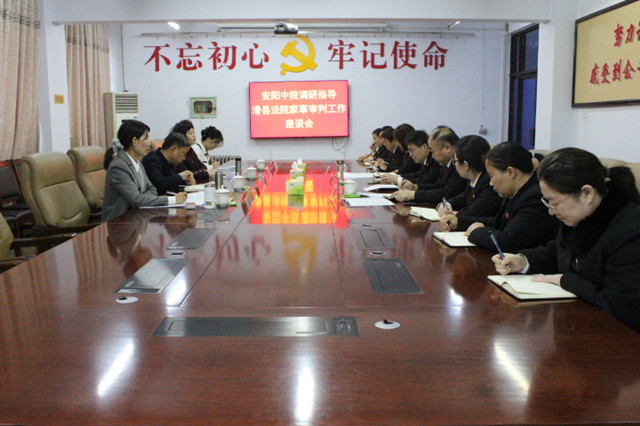 3月17日上午,安阳中院党组成员、副院长常树军,未成年人案件综合审判庭张歆梅一行4人,赴滑县法院调研家事审判工作并召开座谈会,滑县法院党组书记、院长贾红波,党组成员、副院长杨森彪及滑县法院锦和法庭全体正式干警参加调研。