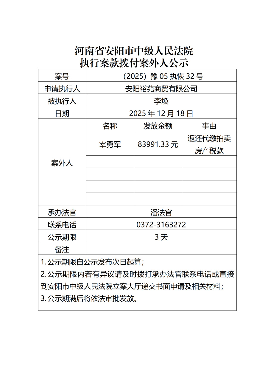 河南省安阳市中级人民法院执行案款拨付案外人公示