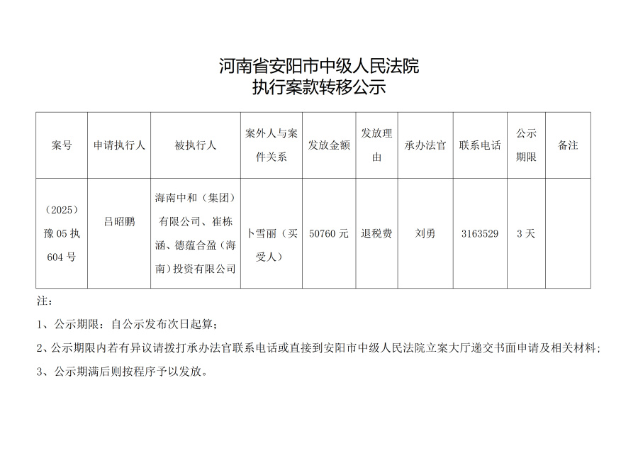 河南省安阳市中级人民法院执行案款转移公示