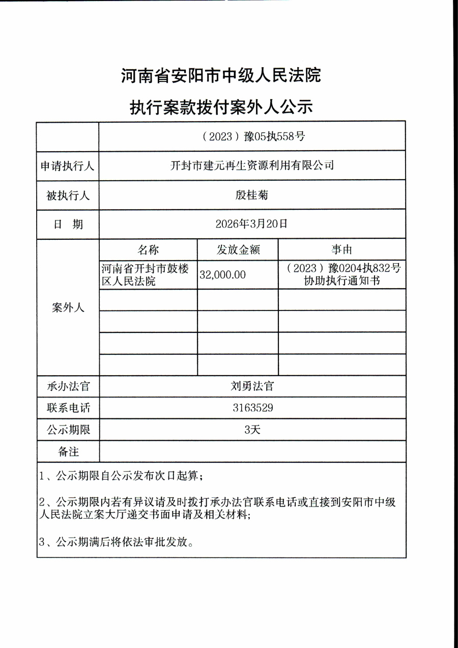 河南省安阳市中级人民法院执行案款拨付案外人公示