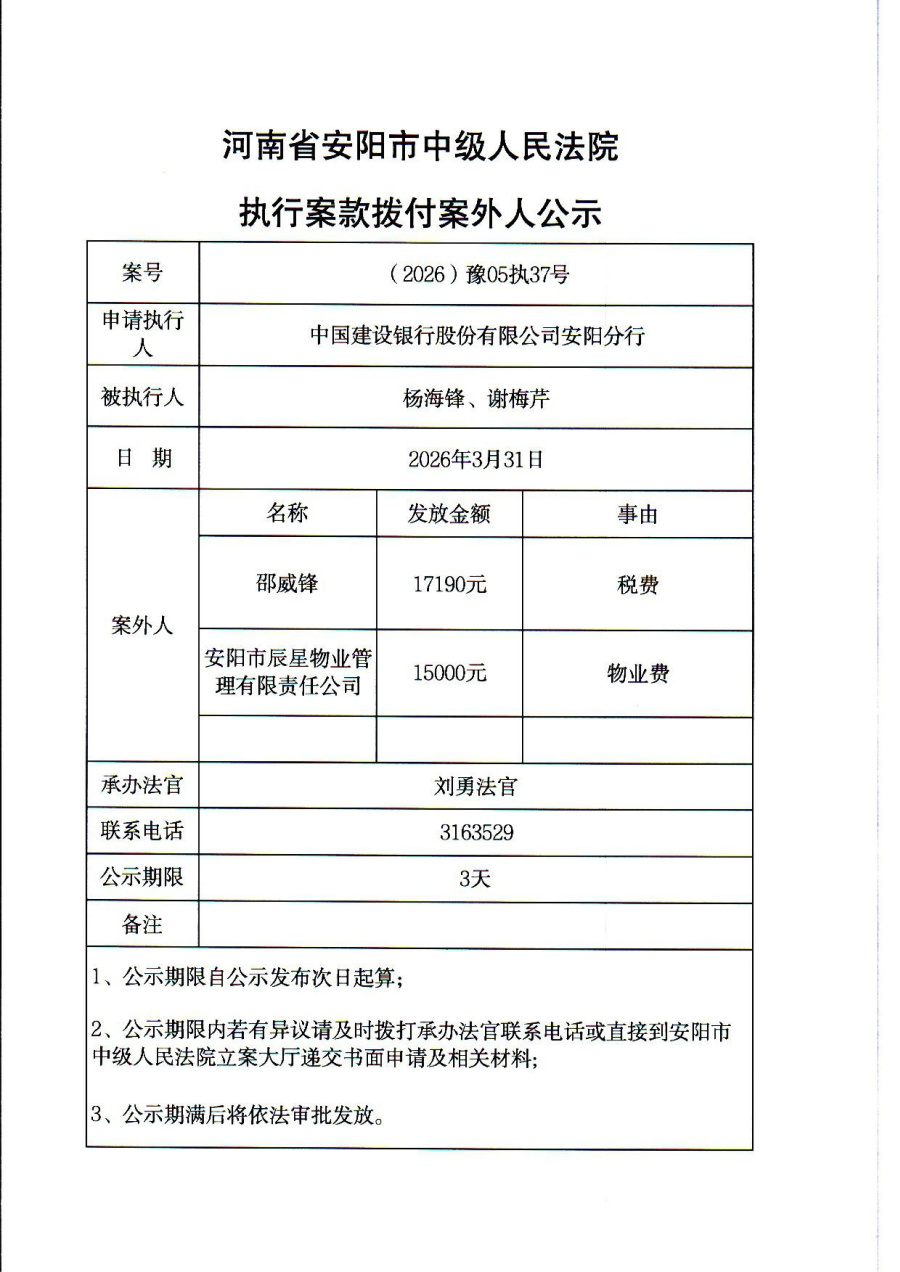 河南省安阳市中级人民法院执行案款拨付案外人公示