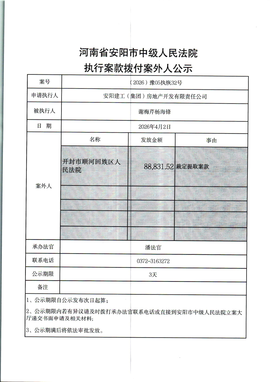 河南省安阳市中级人民法院执行案款拨付案外人公示