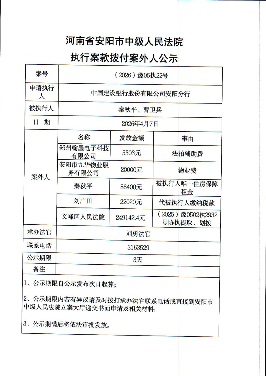 河南省安阳市中级人民法院执行案款拨付案外人公示
