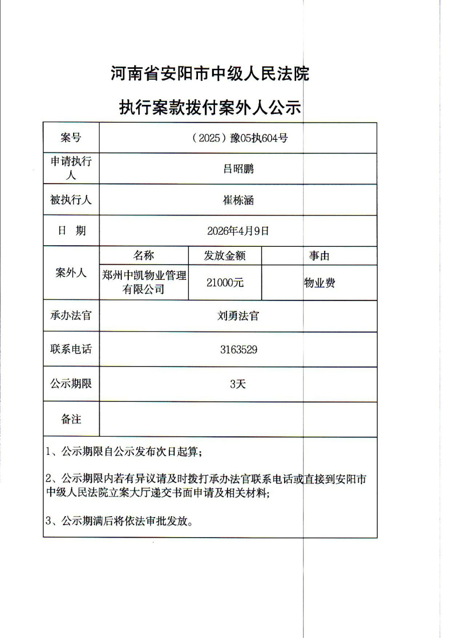 河南省安阳市中级人民法院执行案款拨付案外人公示